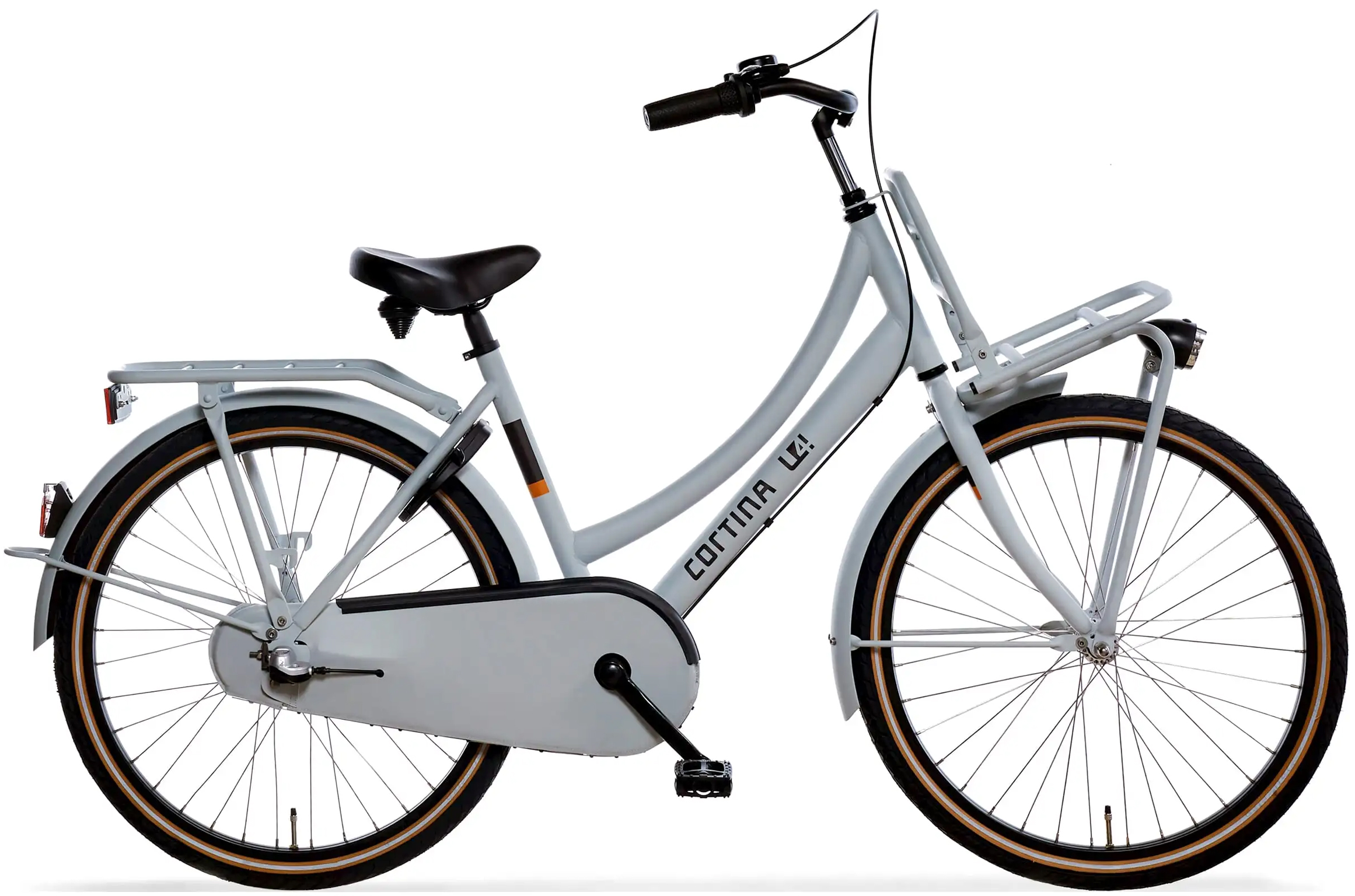 Cortina Transport U4 Mini meisjesfiets in framemaat 24inch. Kleur: Grey Smoot Matte. Uitgerust met achter een Shimano Nexus 3-traps versnellingsnaaf met terugtraprem en voor een standaardnaaf. Opvallende details: voordrager.