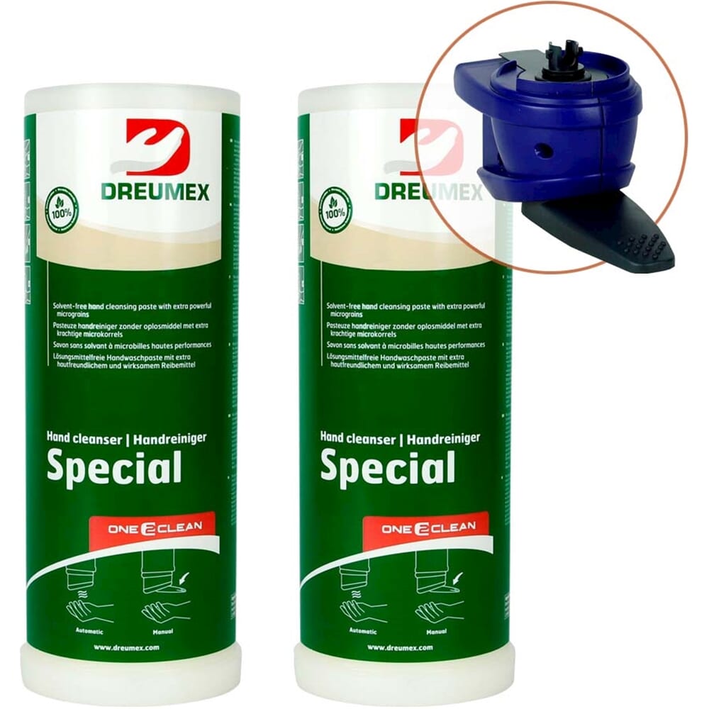 Het Dreumex Starterpack One2Clean Special bestaat uit twee cartridges Dreumex One2Clean Special zeep van 2,8 liter en een handmatige zeepdispenser. Deze oplosmiddelvrije handreinigingspasta kan gebruikt worden voor middelzware tot zware vervuilingen zoals smeermiddelen, diesel, remvloeistof, cement en roest. De pasta is met name geschikt voor gebruik in garages, werkplaatsen en industrien. De robuuste handbediende dispenser geeft een zeepafgifte van 5 ml per keer. Het gebruik van handreiniger dispensers met verwisselbare cartridges is handig en bovenal voordeliger.