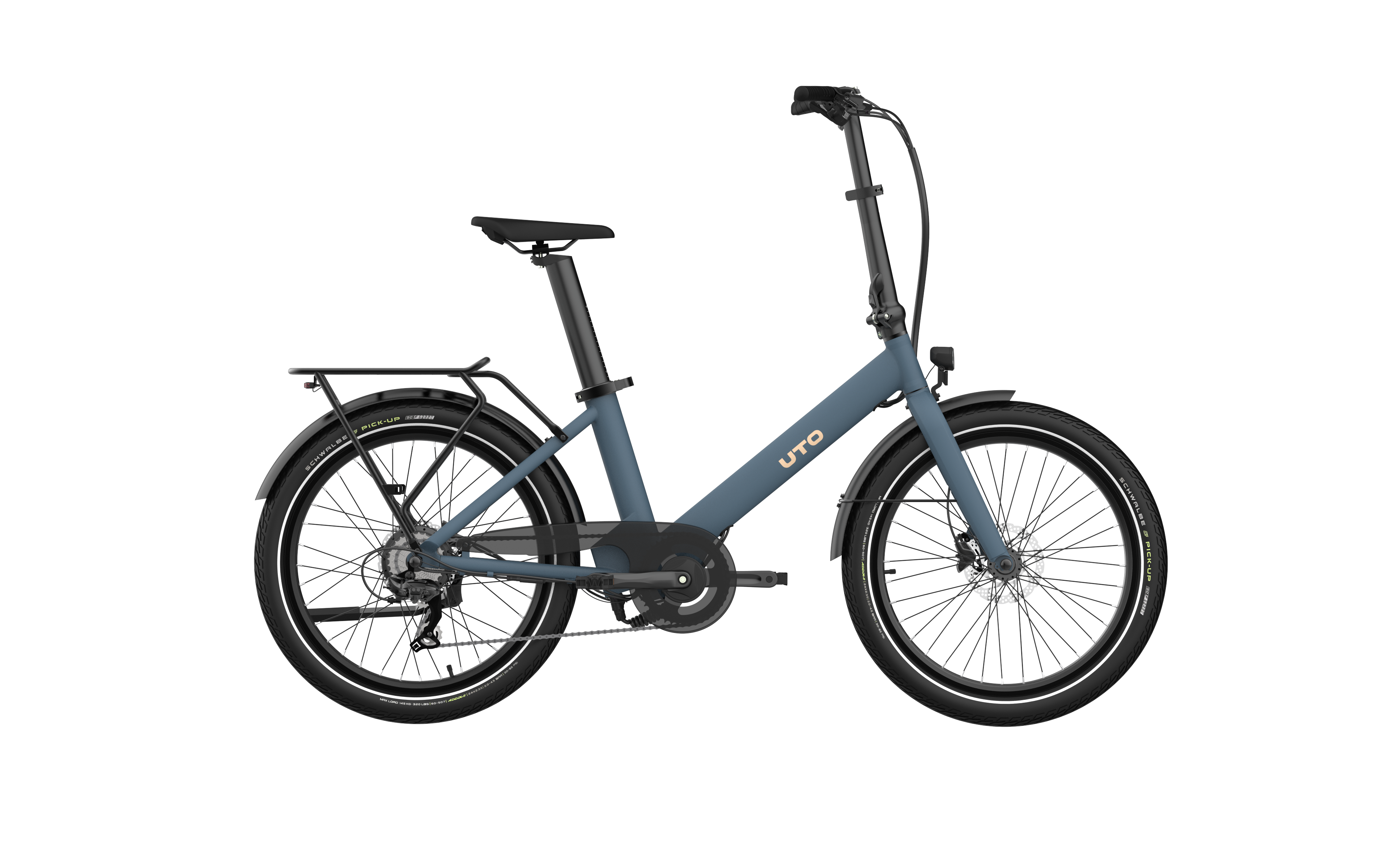 De UTO OG24: De compacte versie van de stadsfiets. Deze wendbare compact fiets (22,7kg) met 24 inch wielen en Schwalbe Pick-up banden heeft een range van ongeveer 70km en is door het opvouwsysteem van stuur, zadelpen en pedalen in elke ruimte of gang tot 30 cm breed op te bergen. Naast het strakke design met gladde lasnaden zijn het de details die het verschil maken: gebogen cockpit, achterdrager, hydrolische Shimano MT200 remmen, 7-speed derailleur, 40Nm 36V 250W achterwielmotor, krachtsensor, uitneembare Samsung accu (36V 10.5 Ah) in de zadelpen met anti diefstal zadelklem, inklapbaar stuur, boordcomputer met usb ingang en voor- en achterverlichting. Verkrijgbaar in 2 kleuren: zwart en blauw. Word standaard met achterdrager geleverd.